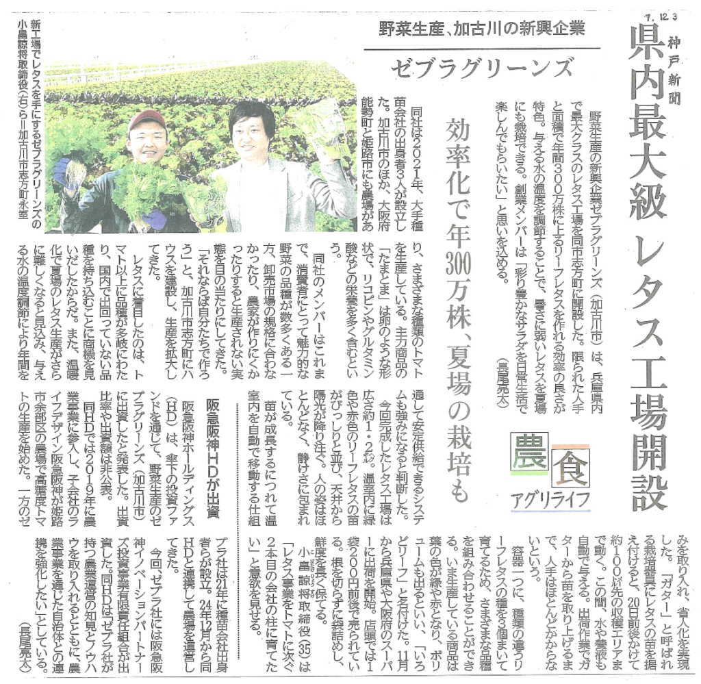 2025年12月3日(水)、リーフレタス事業に関する記事を神戸新聞様に掲載いただきました。
